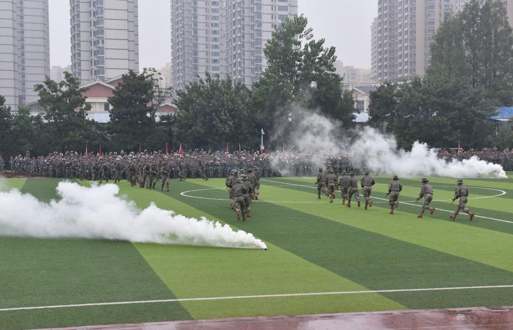 在庄严的国歌声中,五星红旗冉冉升起,军训汇报表演随之拉开帷幕。全体新生有序完成队列行进、格斗、旗语、军歌等特色项目展示。虽然秋雨连绵,但参训新生们姿态挺拔、精神振奋,一招一式有模有样,一举一动铿锵有力,展现了当代青年不怕困难、坚毅顽强的良好风貌。