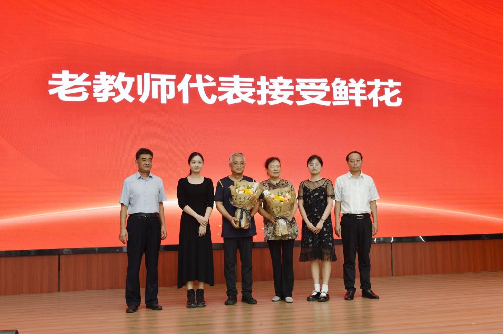 两位老教师代表与党委书记许卫(左一)、院长刘仁金(右一)及献花的年轻教师合影