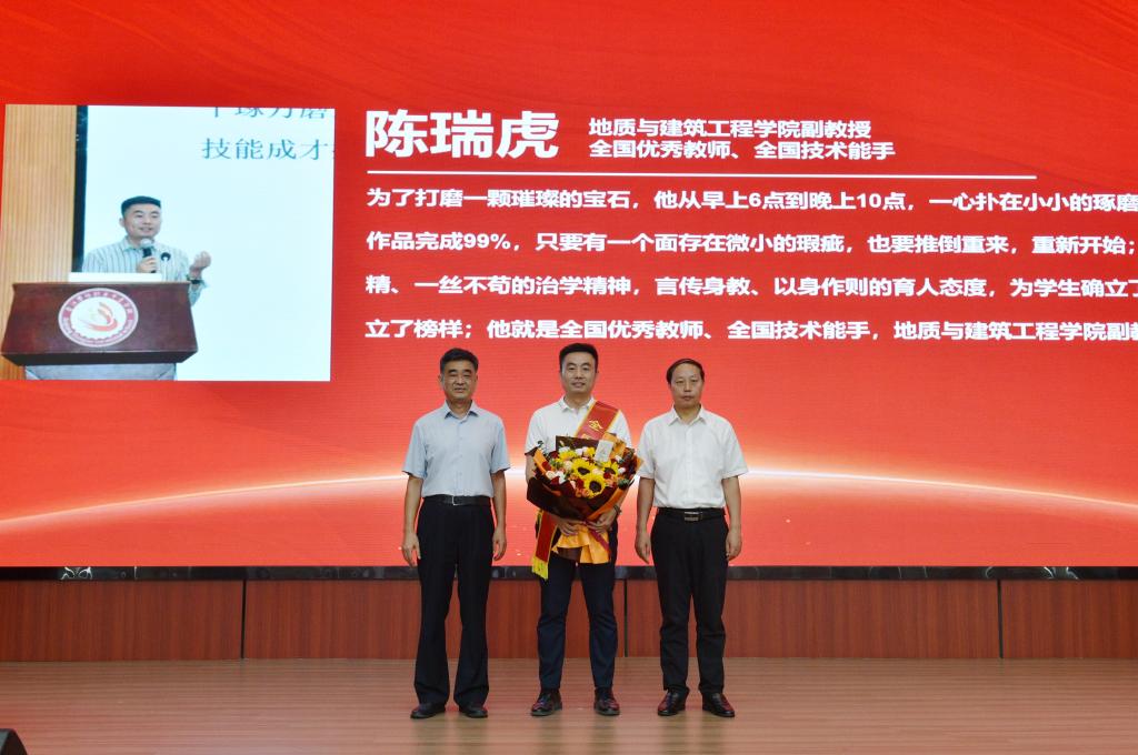 周和平宣读了先进集体和优秀个人名单。在振奋人心的乐声中,同学们排列成行,向荣获全国优秀教师、省教育工作先进集体、省优秀教师、省技术能手、省金牌职工、省五一劳动奖章、省教学名师、省江淮名师、省直机关优秀共青团干部等荣誉称号的老师,向在全国全省职业院校技能大赛、全国行业职业技能大赛、省高等职业院校教学能力大赛、省大学生创新大赛中获奖及指导学生获得优异成绩的老师们献上表达感谢与祝福的鲜花。