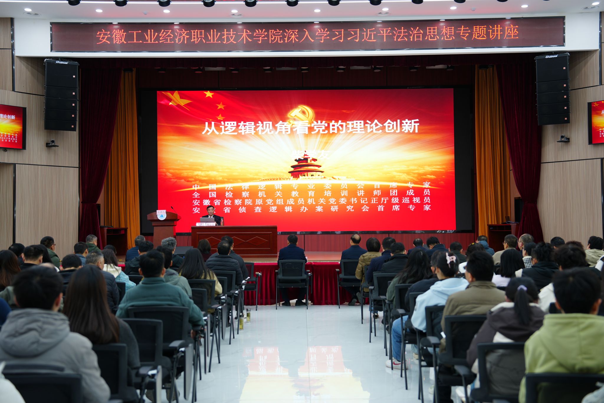 12月9日上午,安徽省人民检察院原党组成员、专职检委、机关党委书记、正厅级巡视员、国家一级高级检察官、中国法律逻辑专业委员会首席专家、安徽省侦查逻辑办案研究会首席专家柴学友应邀来到安徽工业经济职业技术学院为干部师生作题为《从逻辑视角看党的理论创新——兼析党的二十届四中全会精神》的专题讲座。党委书记许卫主持讲座。院领导,全体中层干部、思政课教师、辅导员及学生代表近200人聆听了讲座。