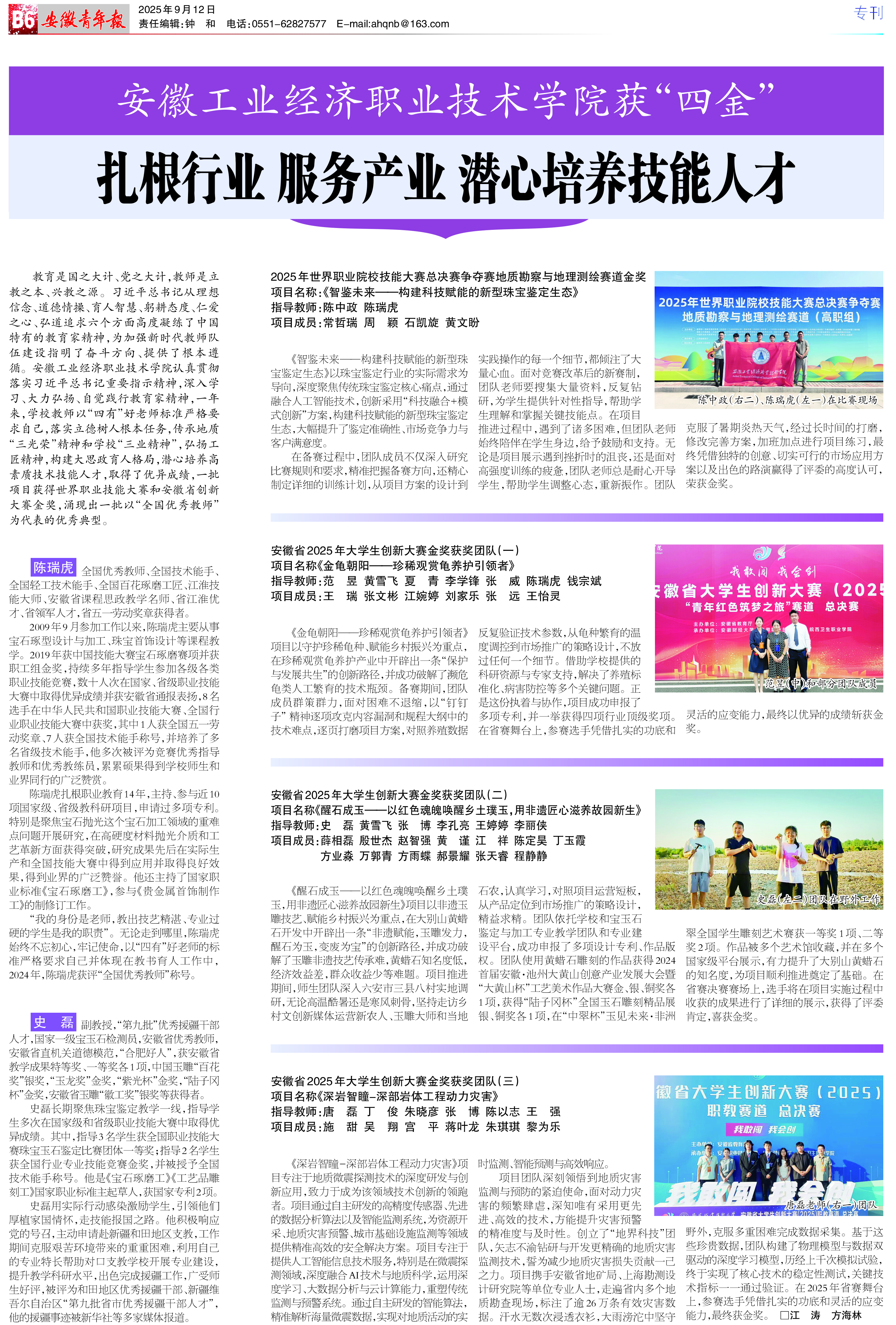教育是国之大计、党之大计,教师是立教之本、兴教之源。习近平总书记从理想信念、道德情操、育人智慧、躬耕态度、仁爱之心、弘道追求六个方面高度凝练了中国特有的教育家精神,为加强新时代教师队伍建设指明了奋斗方向、提供了根本遵循。安徽工业经济职业技术学院认真贯彻落实习近平总书记重要指示精神,深入学习、大力弘扬、自觉践行教育家精神,一年来,学校教师以“四有”好老师标准严格要求自己,落实立德树人根本任务,传承地质“三光荣”精神和学校“三业精神”,弘扬工匠精神,构建大思政育人格局,潜心培养高素质技术技能人才,取得了优异成绩,一批项目获得世界职业技能大赛和安徽省创新大赛金奖,涌现出一批以“全国优秀教师”为代表的优秀典型。