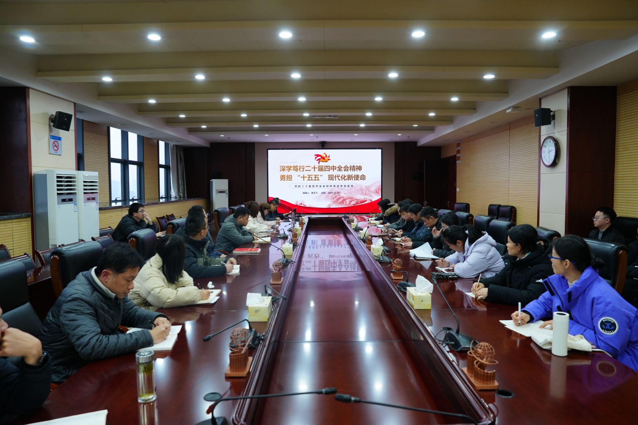为深入学习贯彻党的二十届四中全会精神,进一步凝聚党员教师干事创业的强大合力,12月24日,党委委员、副院长黄雪飞以“深学笃行党的二十届四中全会精神,勇担‘十五五’现代化新使命”为题,为学生处、招生就业处、基建处、团委及智能汽车学院的全体党员讲授专题党课。