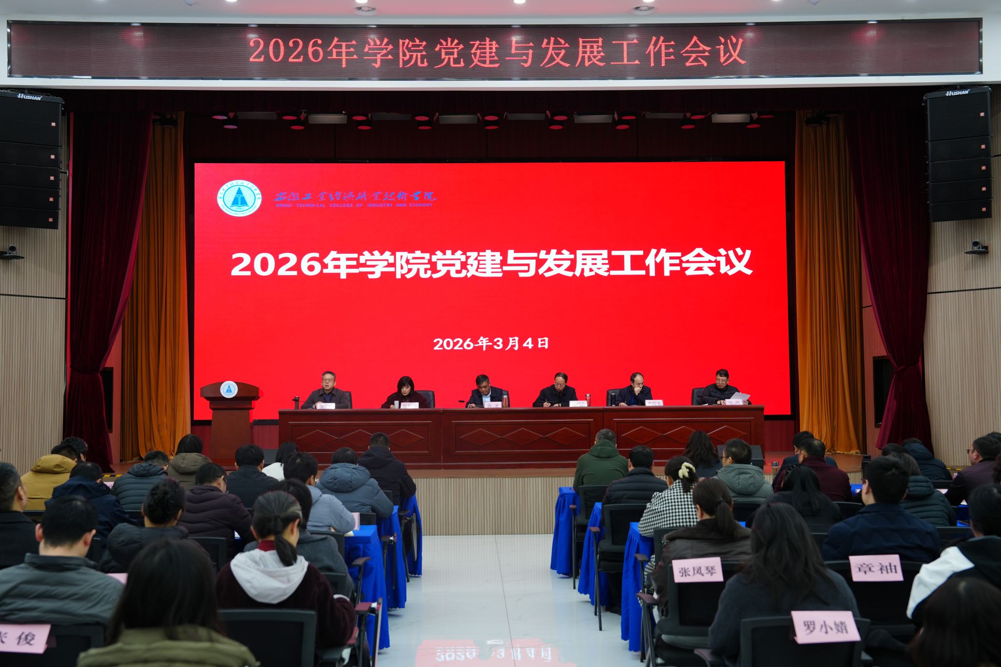 3月4日下午,学院在图书馆一楼报告厅召开2026年党建与发展工作会议。会议深入学习贯彻上级有关会议精神,全面总结2025年工作成效,分析当前发展形势,部署2026年重点任务。院领导许卫、刘仁金、周和平、黄雪飞、吴飞、赵凯出席,在职副科级及以上干部、各教学单位教学秘书、办公室主任、学管干事、团总支书记、各党支部书记、教研室主任参加会议。会议由党委副书记、工会主席周和平主持。