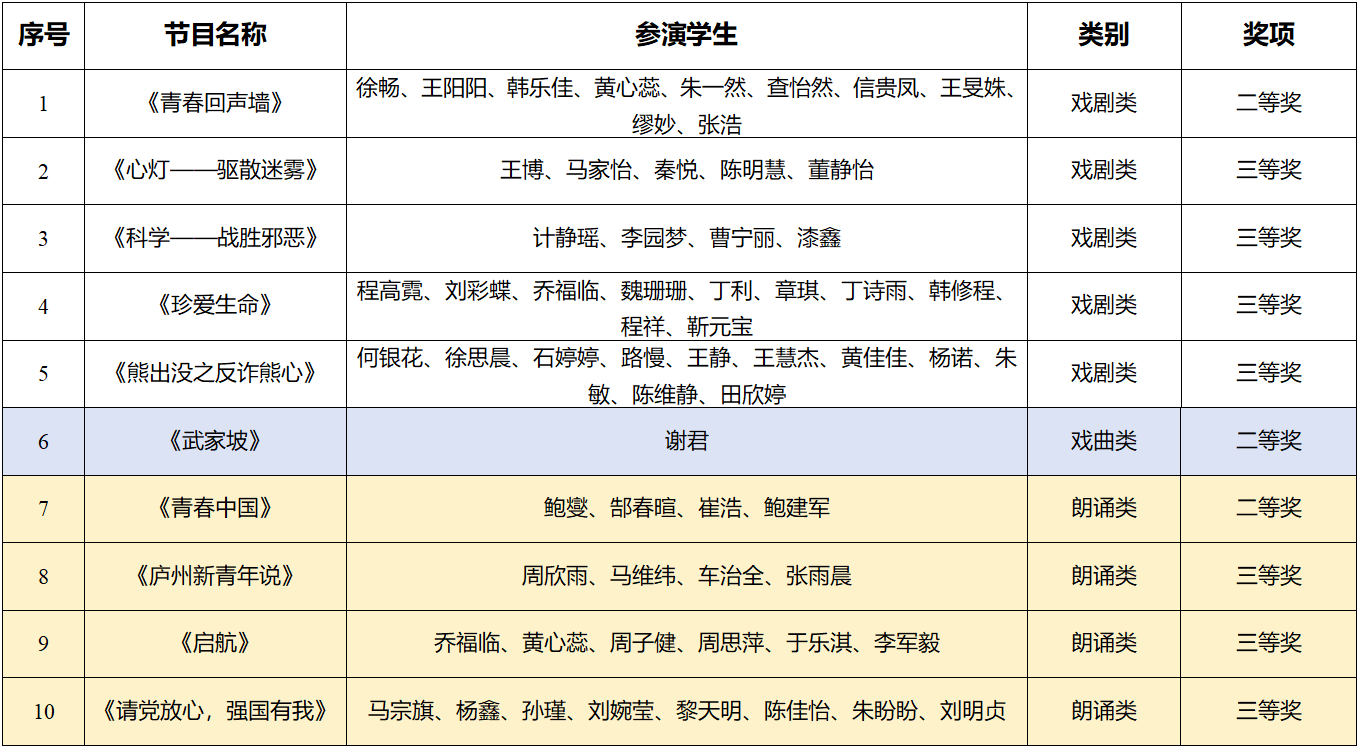 近日,从安徽省教育厅公示的安徽省大学生戏剧(戏曲)与朗诵展演活动评选结果获悉,我院团委选送的10个节目凭借扎实的艺术功底与鲜明的创作特色实现全员获奖,其中3个节目获二等奖,7个节目获三等奖,充分展现了学院在美育教育与校园文化建设中的显著成效。