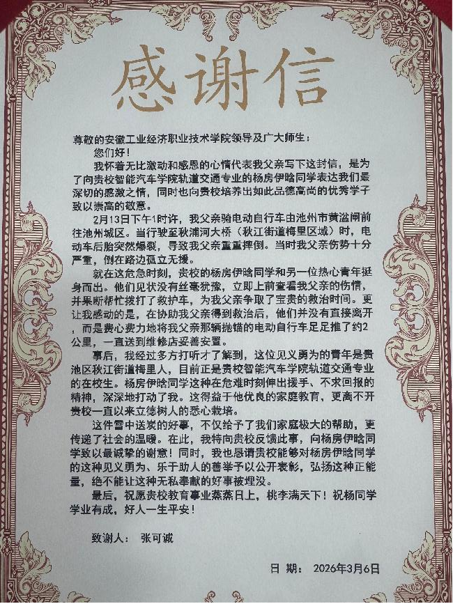 寒假期间,智能汽车学院城市轨道交通机电技术专业22562班学生杨房伊晗路遇一名因电动车爆胎摔倒受伤的行人,他主动伸出援手,事后婉拒酬谢。近日,受助者家属专门向学校寄来感谢信,对杨房伊晗的善行表达谢意。